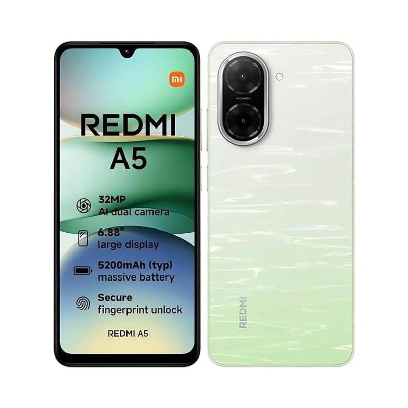Smartphone XIAOMI Redmi A5 - Écran 6,88" (1640 x 720px) - Processeur: UNISOC T7250,Octa-core - Système d’exploitation: Android 15 - Mémoire : 3Go - Stockage : 64Go - Appareil photo arrière: 32 MP - Appareil Photo Frontale: 8 MP - Capacité de Batterie: 5200mAh - HyperCharge : 15 W - Connectivité: 4G, Wifi et Bluetooth 5.2 - Double SIM - Sécurité: Capteur d'empreintes digitales latéral, Déverrouillage du visage par IA - Capteurs: Capteur de proximité virtuel, Capteur de lumière ambiante virtuel, Accéléromètre, Boussole électronique